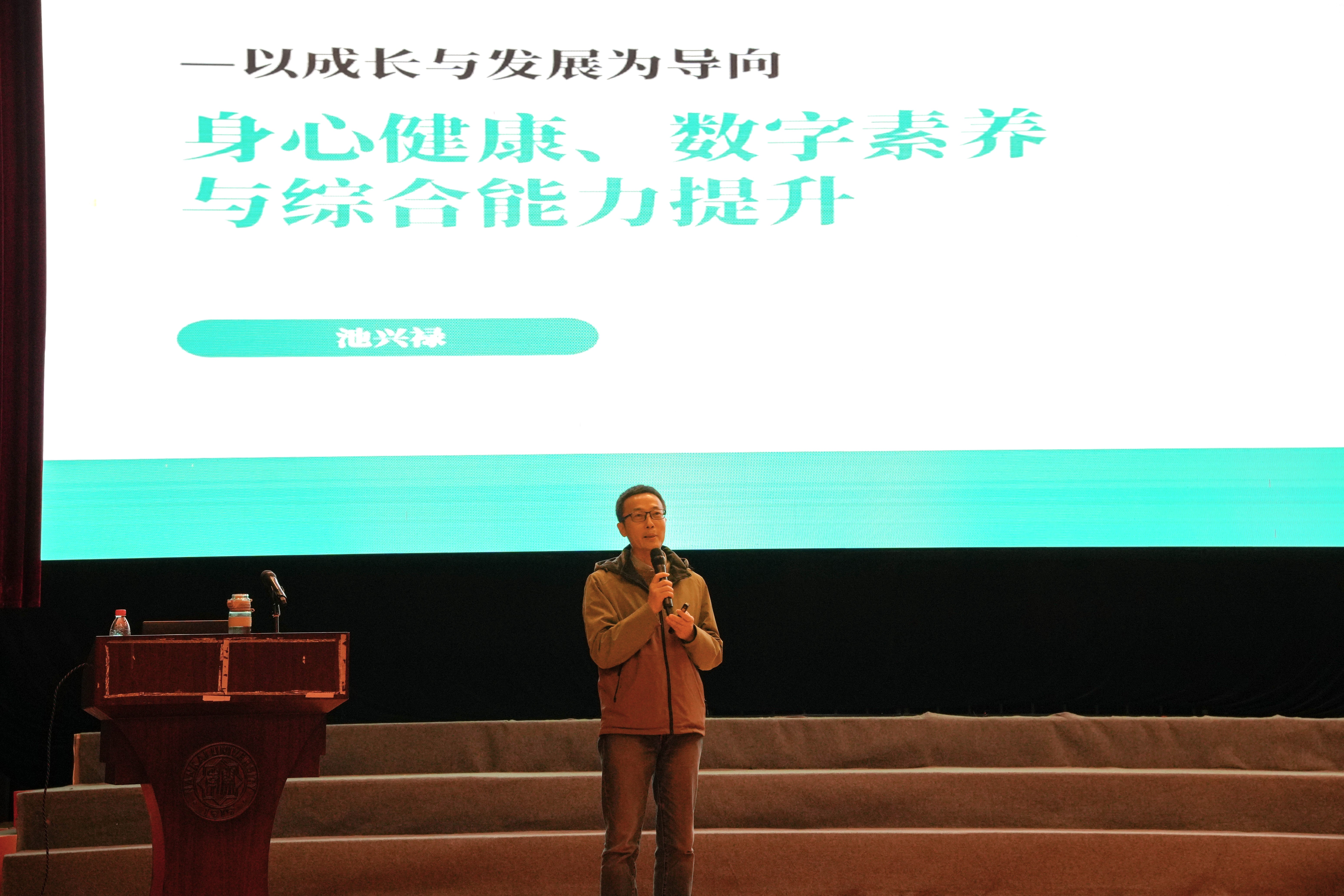讲座中,池兴禄围绕时代背景、身心健康、数字素养与综合能力四大核心板块展开。他指出,当下信息过载、职业迭代加速等趋势下,青年学生需警惕“信息茧房”与“即时满足”的陷阱。针对数字时代的身心挑战,他详细解读了HRV(心率变异性)与认知模式的关联,建议通过规律运动、合理休息筑牢职业发展根基。在数字素养提升方面,他分享了信息筛选、算法反驯化、隐私保护等实用技巧,鼓励学生主动跨界拓展视野。