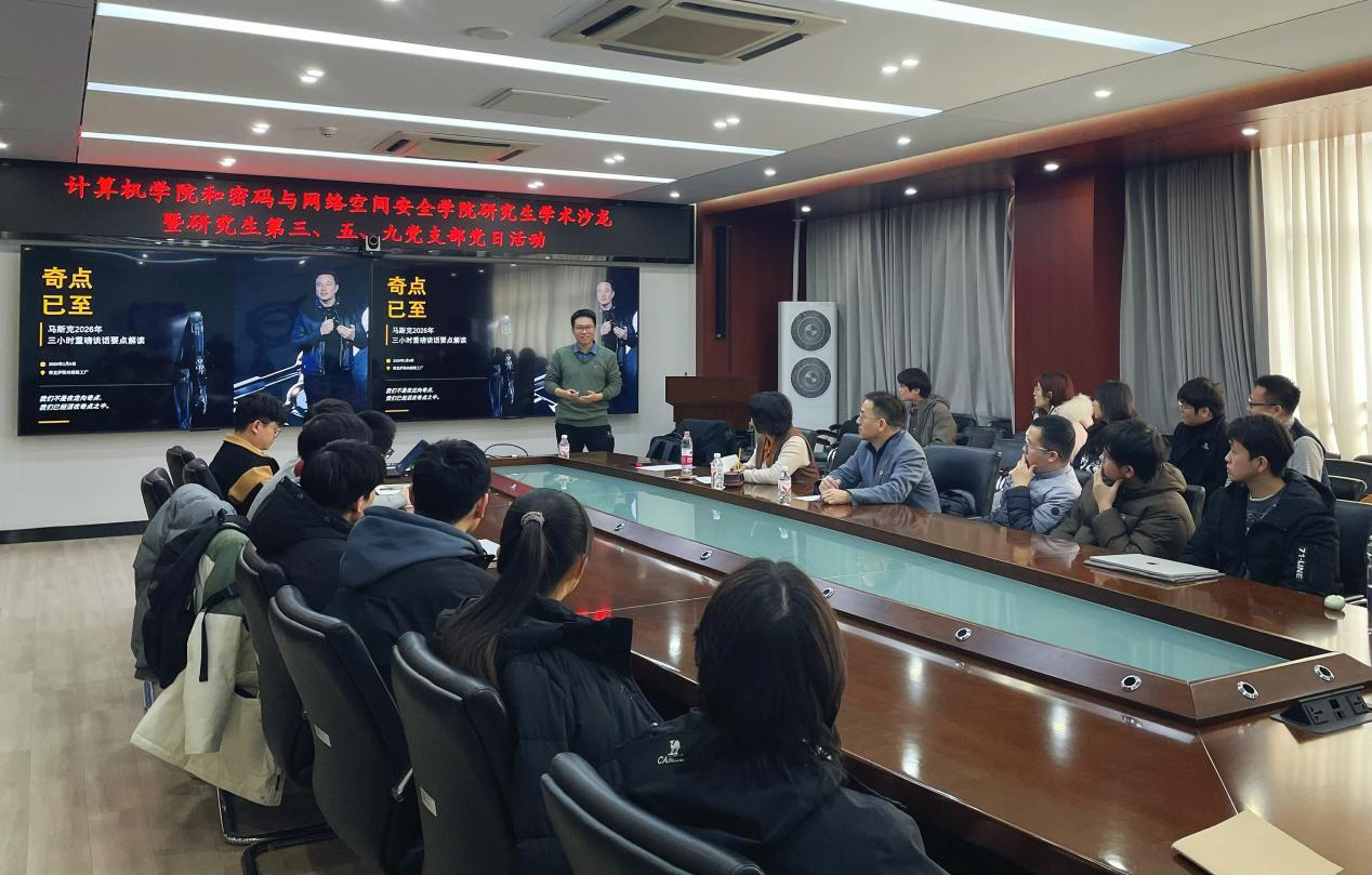 (通讯员 楚乾靖 摄影 彭莉)1月19日下午,计算机学院和h次元 研究生学术沙龙第六期暨研究生第三、五、九党支部联合党日活动以“研途赋能润心晴 科技逐光担使命”为主题,邀请学院李翔副教授主讲。学院党委书记高琪,副书记、副院长沈宝庆出席本次活动,学院研究生辅导员、支部党员及部分本研学生参加。